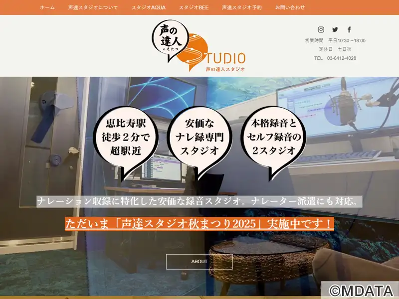 東京恵比寿駅から徒歩2分の場所にあるナレーション録音に特化した録音スタジオ。スタジオAQUAは立ち会い収録が可能な本格スタジオで、最大4名の立ち会いと3名の同時収録が可能です。また、スタジオBEEは完全個室のセルフ録音スタジオで、ボイスサンプル録音や個人の作品作りに利用できる。また、40名以上のナレーターが所属しており、日本語だけでなく英語、中国語、韓国語などの外国語ナレーションの収録にも対応する。