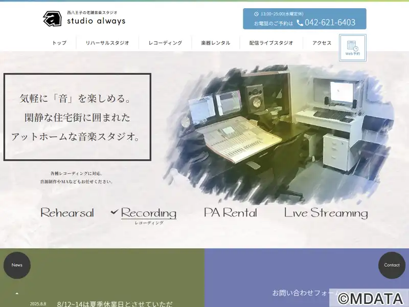 JR西八王子駅南口を出て徒歩10分、西八王子の閑静な住宅街にある老舗スタジオ「studio always」。9畳~28畳の全4スタジオ。月曜・木曜は学割スペシャル20%オフ、金曜18時までは半額のレディース割引。ProTools HDと充実のプラグインによるレコーディング、バンド一発録音、PAレンタル対応。Astは鏡付きでダンスレッスンもOK。スタジオライブ配信&出張配信パックあり。
