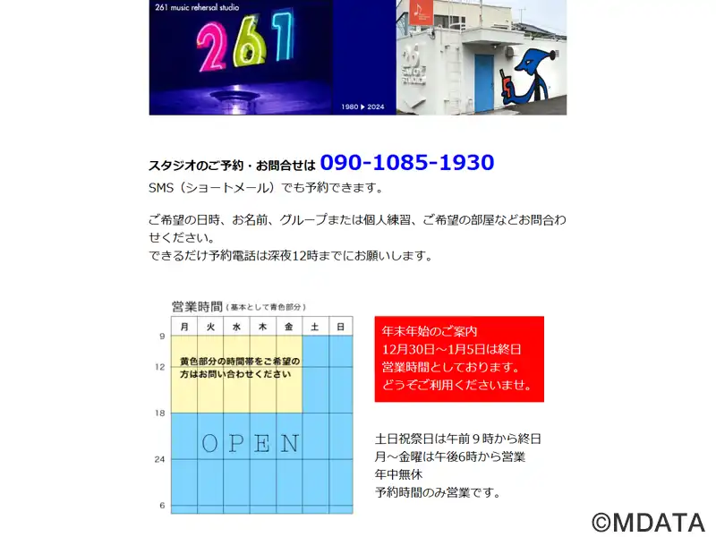 大分市小池原に1980年創業した音楽練習スタジオ。広々とした3つの完全防音のスタジオ(5〜8人用のAスタジオ、3〜4人用のB、Cスタジオ)を備え、個人練習やバンド練習に利用できる。ドラムセットやアンプなどは定番機材を中心に、充実した設備を揃え、キーボード、ギター、ベースなどの楽器や機材のレンタルオプション、リピーターのための機材預かりスペースDストレージなども完備。利用者のニーズに幅広く応えている。