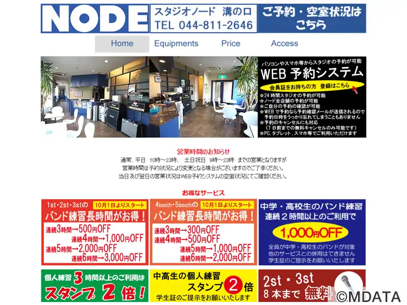 川崎市溝ノ口駅より徒歩約3分の場所にある、リハーサルスタジオ。8帖から15帖の5つの部屋を備える。全ルーム、各楽器パートの音がクリアに聞こえるようデッドな音響設計が施されている。セルフレコーディングに最適なサブルームも用意されている。幅広いジャンルの音楽教室も開講されていて、幅広いジャンルの音楽を学ぶことができる。学割や長時間割りなど、様々な割引プランもあり音楽活動をサポートする。Web予約可能。