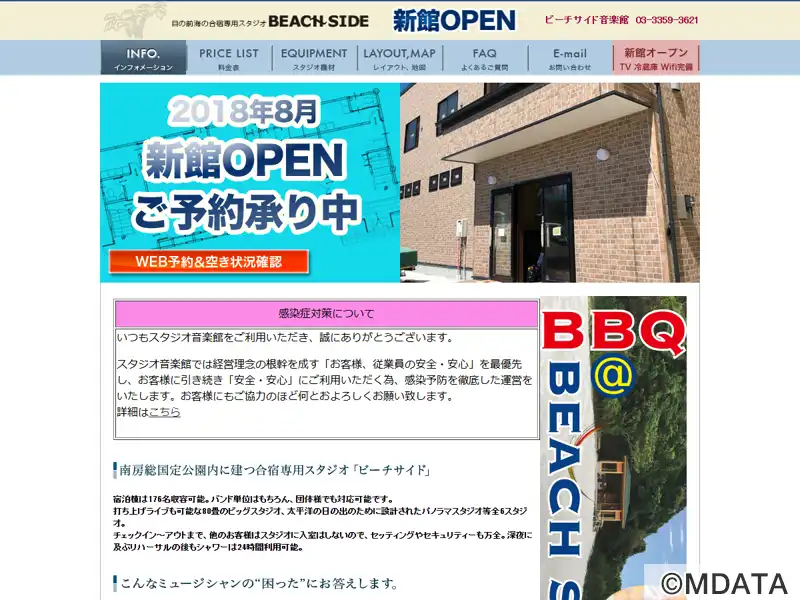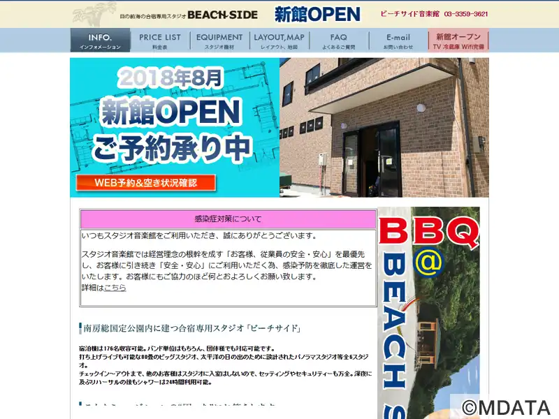 千葉県いずみ市の南房総国定公園内に建つ「音楽館」が運営する合宿専用スタジオ。宿泊棟は176名まで収容でき、バンドや団体でも利用できる。太平洋の日の出が見えるパノラマスタジオを含む7つのスタジオ(本館・別館・新館)があり、80畳のPearlスタジオではプリプロや打ち上げライブも可能。独占利用でセキュリティも安心。深夜のリハーサル後も24時間シャワー利用可。音楽制作に集中できる最高の環境を提供する。