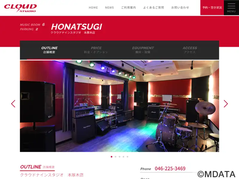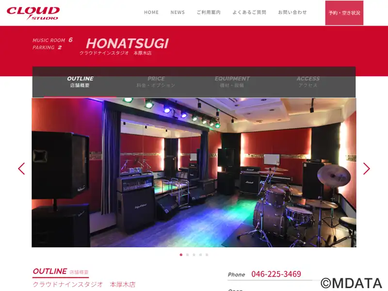 神奈川県本厚木市にある、小田急線本厚木駅から徒歩2分の距離にある、クラウドナインスタジオの本厚木店。多彩なドラムセットやギターアンプヘッドなど充実した機材を装備。20帖のAスタジオでは、レコーディング用にフロアへのシグナルアウトが可能で、レコーディング作業も快適。バンド練習、個人練習、のほか、タップダンスや撮影など多目的に使える。完全バリアフリー設計で、機材の搬出入も施設エレベーターを利用できる。