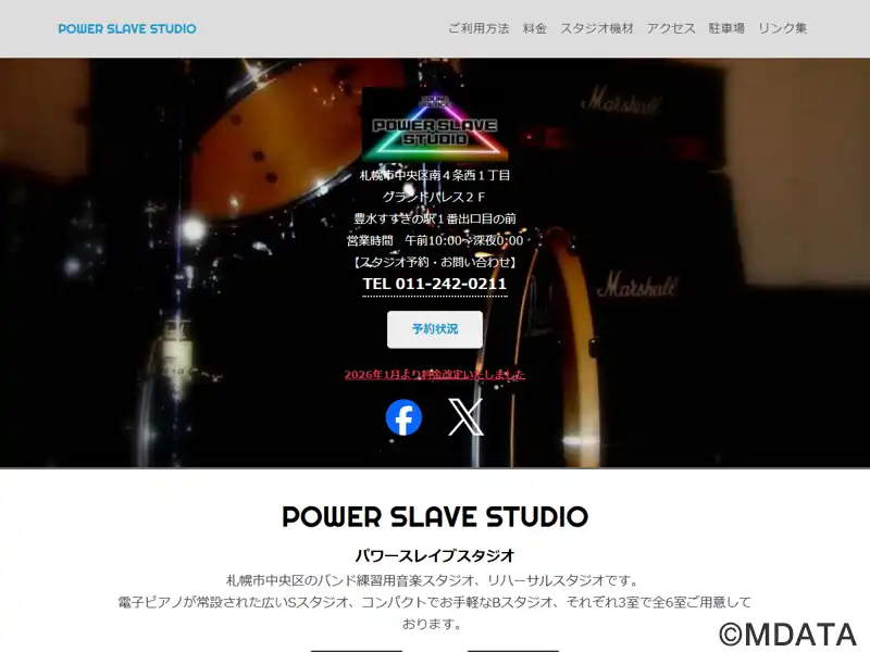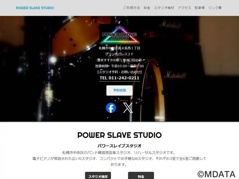 札幌市中央区の豊水すすき駅の1番出口前にある音楽リハーサルスタジオ。「S Studio」1・2・3は、札幌市内の主なライブハウスのステージに似た形や広さを持つ部屋で、一面に鏡があるため、本番向けのリハーサルに最適。また「B Studio」1・2・3の3部屋は、バンド練習用にコンパクトで気軽に利用できる。無料貸出機材として、電子ピアノ、マイク、シンバルスタンド、チューナー、ケーブルなどが用意されている。