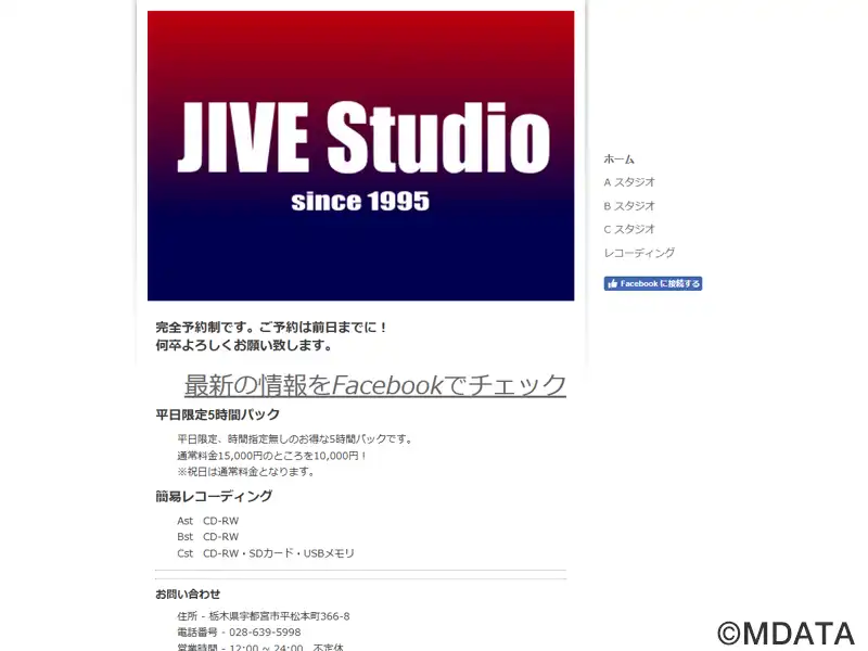宇都宮のレコーディング&リハーサルスタジオ「ジャイブ」。2019年10月に新装リニューアル。Aスタ(7J)とミキシングルームを挟んだBスタ(5.5J)と鏡張りのCスタ(15J)の3部屋があり、ワイヤリングチューンアップで高音質なレコーディングも可能。各ジャンル対応のこだわりのアンプ類、天井据付けマイクからセルフRECも可。地域一番店をめざして営業中。駐車スペース13台。