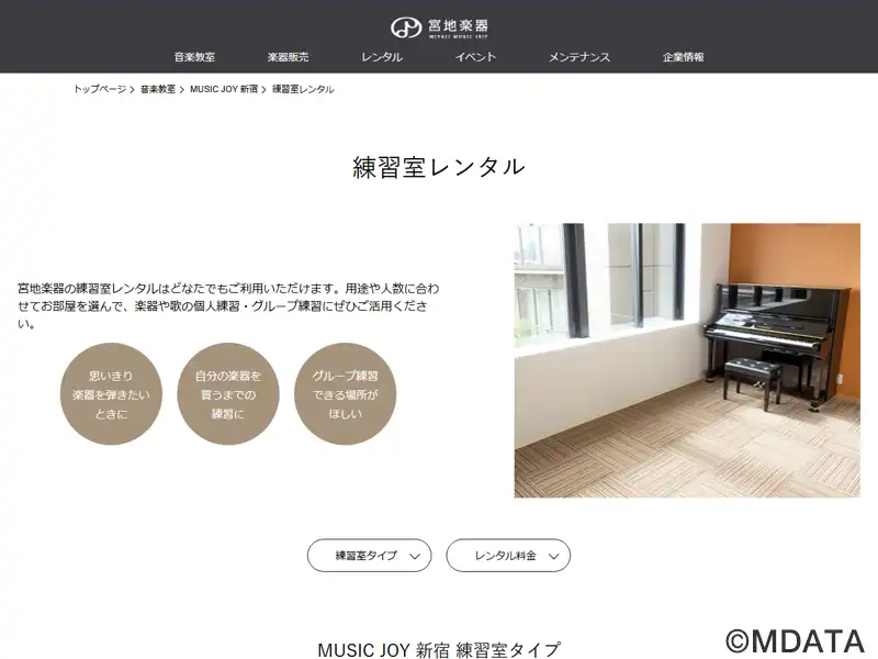 西新宿の都庁近くに位置する宮地楽器のMUSIC JOY新宿の音楽教室&スタジオ。音楽教室では、ピアノ、弦楽器、管楽器、歌、ギターなどのスタンダードなコースから、民族楽器、アンサンブルレッスンなど全50コース以上の豊富な音楽教室を展開。また、一般の方も利用できる練習室レンタル10室を用意。ドラム、グランド・アップライトピアノ、エレクトーンなどをそれぞれ配備した、大小様々な練習室を提供している。