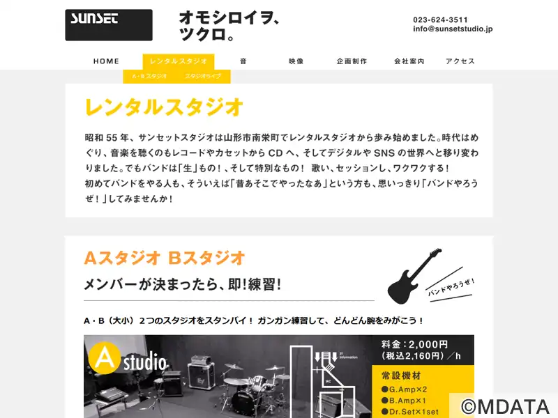 山形市中桜田にある、音響・映像・企画制作などを手がける株式会社サンセットスタジオのレンタルスタジオ。Aスタジオは、ライブゲネやステージを使った練習、スタジオライブも可能。Bスタジオはバンドのグルーヴを感じながら練習できる6畳スペース。ProTools対応マルチレコーディングルームと各スタジオを連動させた幅広いレコーディングに対応し、プロユースの映像制作編集ルームを完備している。駐車場約10台あり。