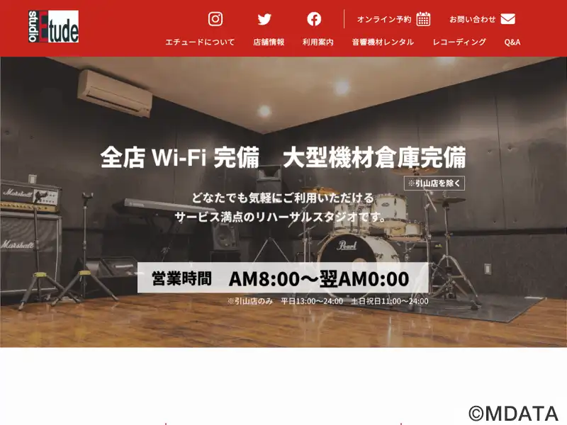 愛知県のJR東刈谷駅北口から徒歩4分に位置する音楽スタジオ。4つのリハーサルルームと広々としたミーティングルームを備え、各部屋にはアンプやドラム、キーボードなど充実した機材が揃う。ステージリハーサルを想定した16畳のDスタジオでは、鏡やモニタースピーカーを設置して本番に近い環境での練習が可能。バンド練習のほか、ダンスや動画撮影、個人練習など多目的に利用可能。Wi-Fiや大型機材倉庫も完備している。