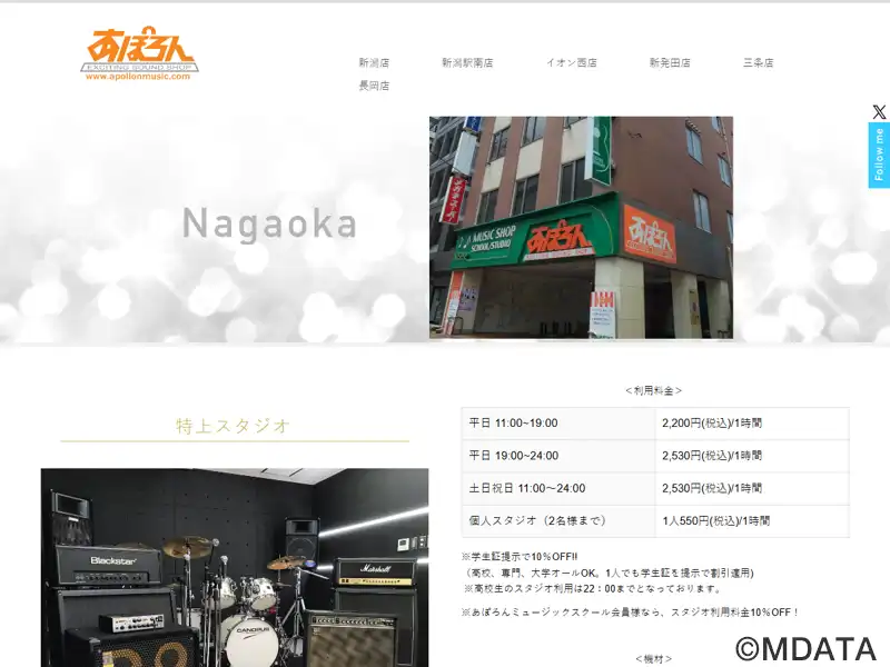 新潟県長岡市にある、あぽろんが運営する音楽スタジオ。バンド練習やレコーディングなどに利用できる。マーシャルやブラックスターのギターアンプ、マークベースやハートキーのベースアンプ、CANOPUSやPearlのドラムセットなど、幅広い音楽ジャンルに対応した高品質な機材を完備する。楽器のレンタルもあり、学校や仕事帰りに手ぶらで練習できる。楽器の修理・メンテナンスサービスも提供。スクール会員の割引設定あり。