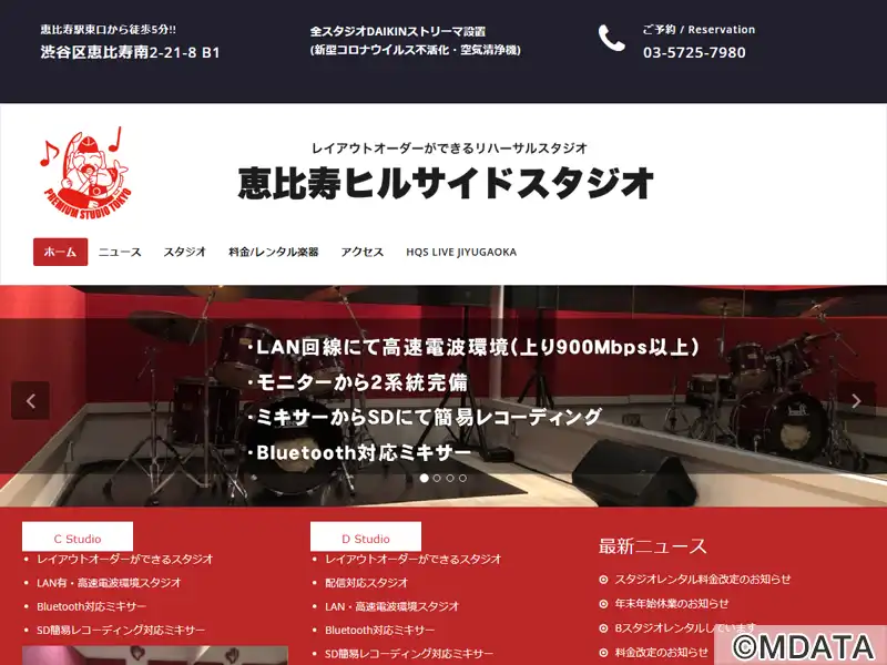 渋谷区にあるJR恵比寿駅から徒歩圏内の音楽スタジオ。2017年に内装と音響を全面的にリニューアルした。バンドリハーサル用のスタジオ4室と個人練習用の部屋を合わせて5室を提供。最大のDスタジオでは、30人を収容するスタジオライブが可能。高速インターネット、Bluetooth、管理用レコーディングミキサーを備え、動画配信にも対応。Eスタジオにはアコースティックピアノもあり、様々なニーズに応えている。