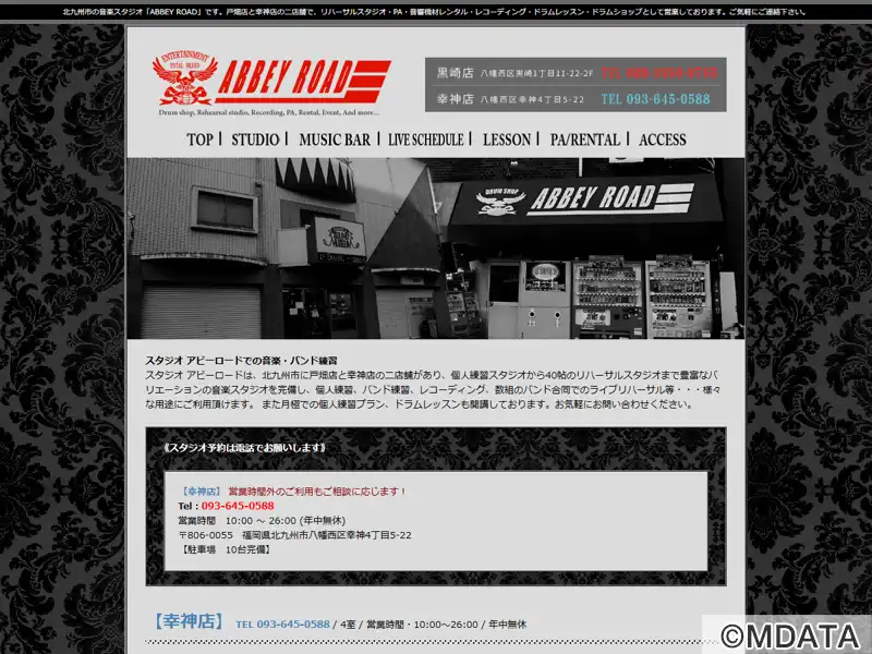 北九州にある老舗リハーサルスタジオ「ABBY ROAD」の戸畑店。個人練習から40帖の大型リハーサルスタジオまで取り揃えた、練習やレコーディングに最適な環境を提供する。2階にはミュージックバーを開設し、フード&ドリンクを楽しみながら、バンドライブや、同窓会、打ち上げにも利用できる。また、ドラマー大平啓人氏による、初心者から上級者まで対応したドラムの個人レッスンも開講。八幡西区にも「幸神店」もあり。