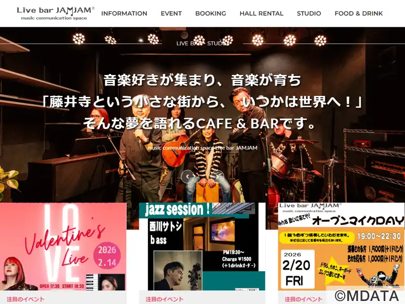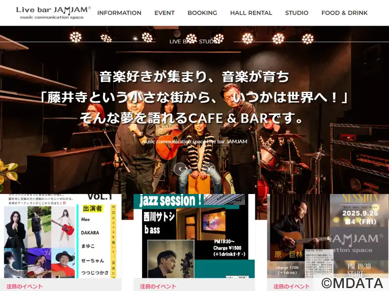 大阪の藤井寺駅から徒歩2分の場所に1982年開業したライブカフェ兼音楽スタジオ。ライブ感覚を重視したスタジオA(約11畳)と、パワフルなサウンドを重視したリーズナブルなスタジオB(約8畳)の2部屋を貸し出し。カフェは昭和の雰囲気が残る空間に、エレピア、アコギ、カホンなどの機材を常備。ドリンクや軽食を楽しみながら、アコースティックライブも楽しめる。ブルース、ジャズなどのオープンマイクイベントも開催。