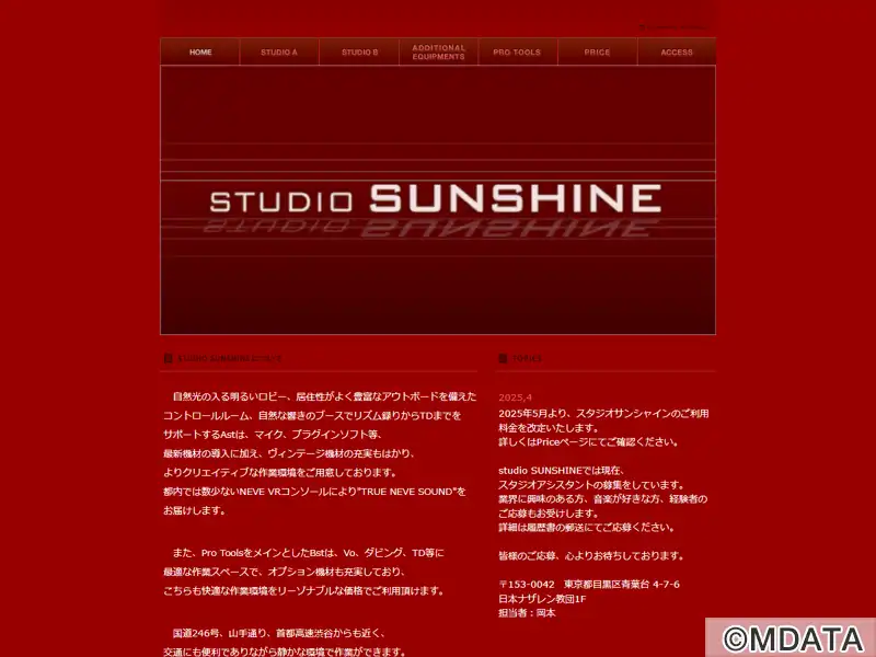 渋谷池尻にあるプロユースのレコーディングスタジオ。メインブース、2つの個別ブース、コントロールルームからなるSTUDIO Aと、DAWプロダクションを中心にコンパクトなレコーディングに最適なSTUDIO Bの2部屋で構成される。メインコンソールにはNeve VR60を導入。多数のヴィンテージ機器が用意されている。チーフエンジニアは多くの作品を手がけ、プロ音楽録音賞受賞経歴もある川本ゴン太氏が務める。