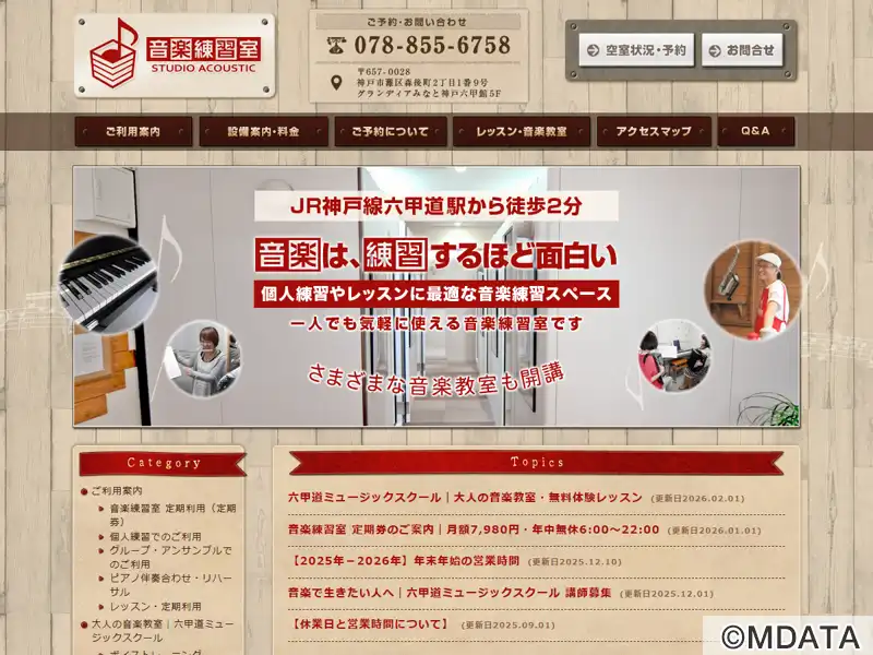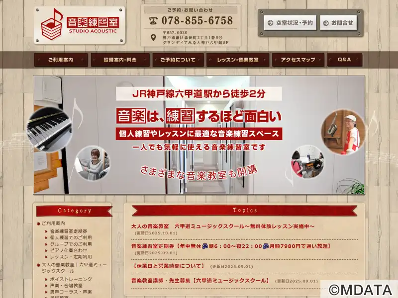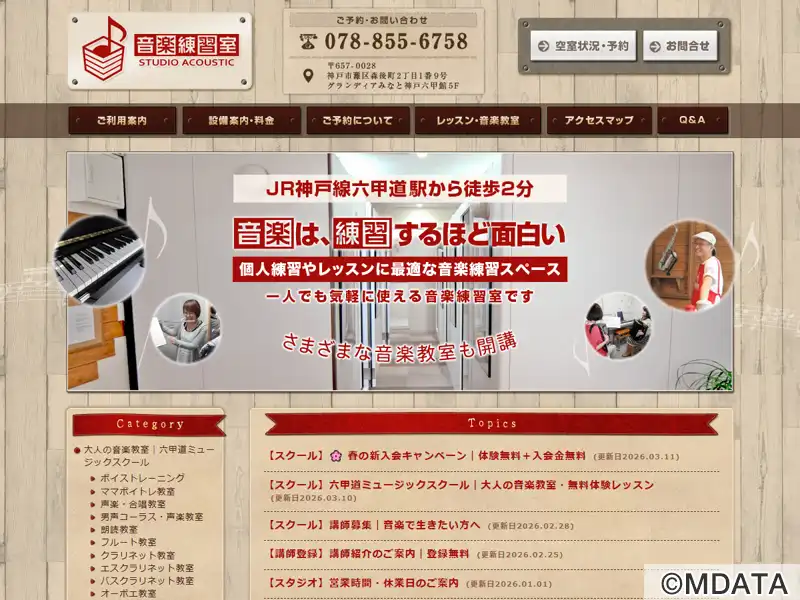 JR神戸線六甲道駅徒歩2分のアコースティック楽器専門の音楽練習スペース。アップライトピアノ(M・L・7A・7B)、電子ピアノ(LL)、声楽・管楽器・弦楽器の練習に適したピアノ無しSルームなど、1名~10名まで利用可能な大小6タイプの練習室があり、個人練習や伴奏合わせ、レッスン、さまざまな楽器編成で気軽に利用できるお手頃な価格設定。朝10時から夜10時まで営業。