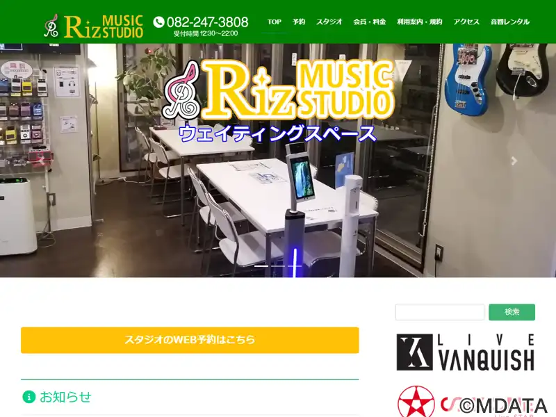 広島市内中心地に2012年にオープンした音楽スタジオ。バンド練習や個人練習、ライブリハーサルに使える3畳から17畳までの全8室を備えている。一面ミラーと独立音響電源を備えた部屋や、ボーカル・ドラム専用ブース、大型機材を預かるストックルームも完備されている。1階の立体駐車場からは専用エレベーターで直接アクセス可能。会員特典の無料コーヒーやくつろげるウェイティングスペースなど、快適な環境を用意している。