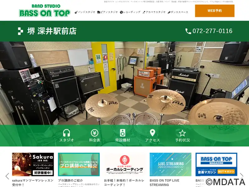 大阪府堺市に1989年開業した、音楽スタジオ・ベースオントップ1号店。泉北高速線深井駅から近く、泉州エリアや大阪南部のバンドマンに利用されている。マルチトラックレコーディング対応のAスタ、や泉州エリア最広のCスタ(13.2帖)など全5部屋を備え、バンド、アカペラ、ダンス、ピアノの練習、レコーディングなどに対応する。充実した機材とミーティングスペースを提供。プロからアマチュアまで幅広く利用されている。