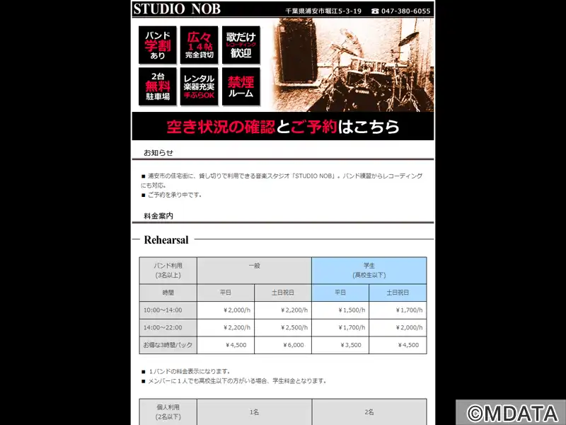 浦安にあるバンド練習レンタルスタジオ。広々14帖の1フロアを貸し切りで利用可能で、ギターアンプにJC-120、Marshall、ベースアンプにAmpeg、Fender、ProToolsによるレコーディングシステムを完備。バンド練習、個人練習、レコーディング、歌録りなどに利用でき、レンタル楽器も充実。また、ドラム、ギター、ベース、シンセ&キーボード、DTM等のレッスンも行なっている。無料駐車場2台あり。