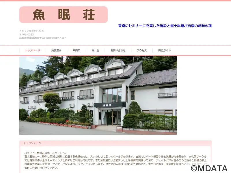 富士西湖の湖畔にある地元料理が自慢の音楽合宿・セミナーに最適な宿泊施設。グランドピアノがあり総合練習や全体会議に最適な最も広い「第1ホール」、中規模で、パート練習やグループ研修に適している「第2ホール」、畳でゆったりとした研修や夜のパーティーなどにも使用できる「第3ホール」が用意されている。全客室にテレビと冷暖房完備、ジェットバス付きの浴場が2つあり。最大宿泊人数120名。学生合宿などの全館貸切も可能。