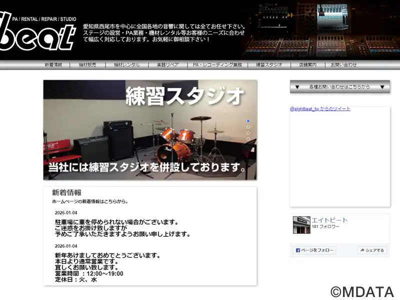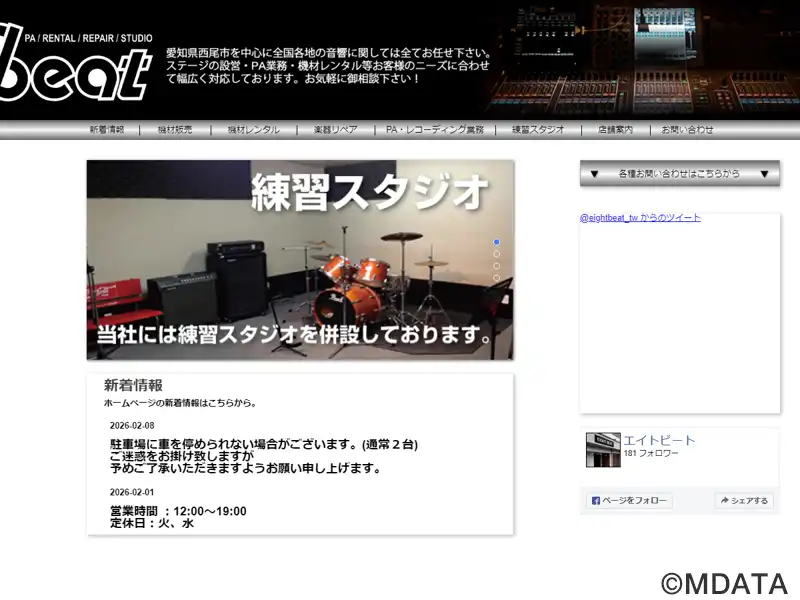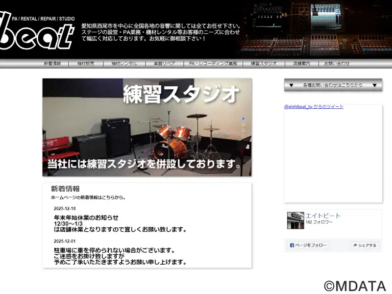 愛知県西尾市にある音響に関するプロショップで、音響機材のレンタル、ステージ設営、PAレコーディング、楽器リペアなど、様々なサウンドに関するサービスを提供する。併設されているバンド練習スタジオは、約11帖で、使用料(1時間)は、個人練習900円、2人で1,100円、3人以上は1,800円。ギターアンプ3台、ベースアンプ、Keyアンプ、ドラム、マイク×4が常設。機材の扱いに精通したスタッフが常駐する。