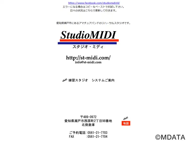瀬戸市にあるアマチュアバンドのリハーサルスタジオ。Aスタジオ(4,1m×5,1m)Bスタジオ(4,6m×6,1m)の2部屋。バンド練習はもちろんドラムやベースなど個人練習、大音量でのギターのサウンド作りなど個人練習¥800/h~。1ヶ月間に10時間以上の予約で大幅割引(A¥1,500/h,B¥2,500/h)。国道363号のドラッグスギヤマとケンタッキーの間の道を曲がって、中日サービス向かい。