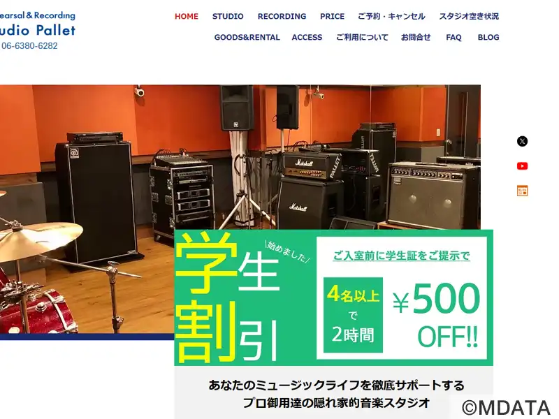 大阪府吹田市、関大前駅北口にある音楽スタジオ。1Studio(19帖)、2Studio(15帖)、3Studio(11帖)、4Studio(9帖)の4部屋があり、目的に応じたリハーサル・レコーディングが可能。1Studioにはdwのドラムを常設。全スタジオにCD-Rが設置され、練習内容をそのままCD音源にして持ち帰りできる。Pro ToolsHDシステムも完備で、様々な形態でのレコーディングが可能。