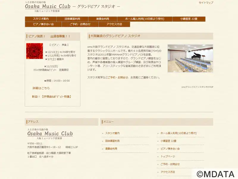 大阪難波なんばパークス近くにあるクラシックホール。最大60名収容可能で、70㎡の広さの空間はアコーティックな室内の響きに留意した設計で、防音施工も万全で、騒音を気にせずに演奏できる。2011年製のヤマハグランドピアノC5が設置され、発表会、コンサート、声楽やクラシック楽器の個人、グループ練習などのさまざまな用途に利用できる。2023年には、少人数利用の防音音楽室を増設、さらに多様なニーズに対応。