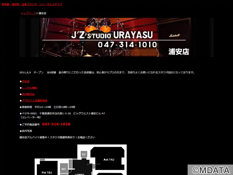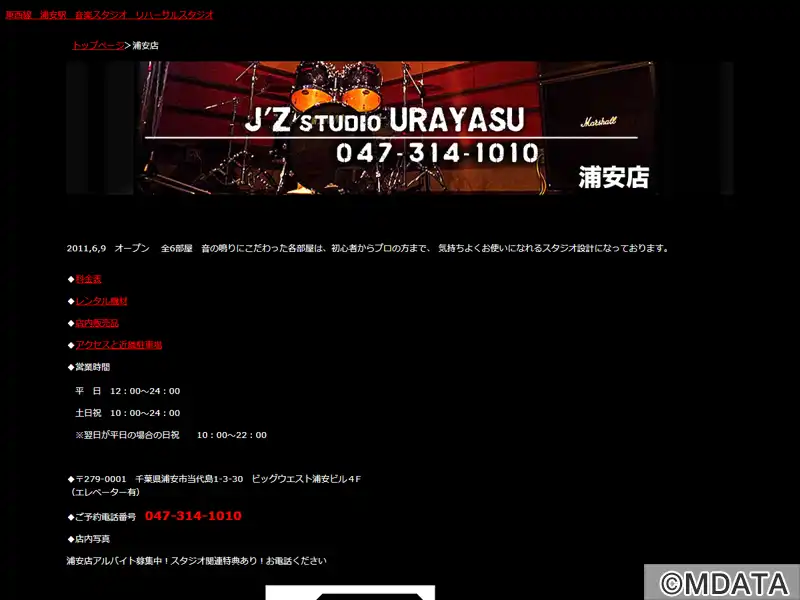 浦安市の浦安駅北口近くにある、音楽にこだわったリハーサルスタジオ。2011年6月にオープンしました。6つのスタジオルームは、音の鳴りを重視した設計で、初心者からプロまで快適に利用できる。小物やアクセサリーの販売、レンタル機材も充実。また、ギター工房gen社と提携し、ギター、ベース、アコースティックギターの修理も可能。楽器を預かり、当店で修理して受け取ることもできる。エレベーターも完備している。