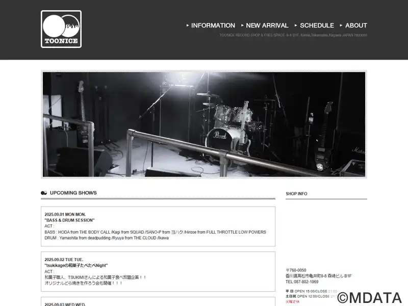 高松市の菊池寛通りTOONICEのライブスペースは、イベント時以外はバンドリハーサルスタジオとしても利用可能。20時から27時まで(水曜日にはお店のOPEN時から)。バンド利用で1時間1,500円、個人練習は一人様450円 (当日予約のみ)。IMPULSE RECORDSオーナー井川氏がプロデュースするお店。