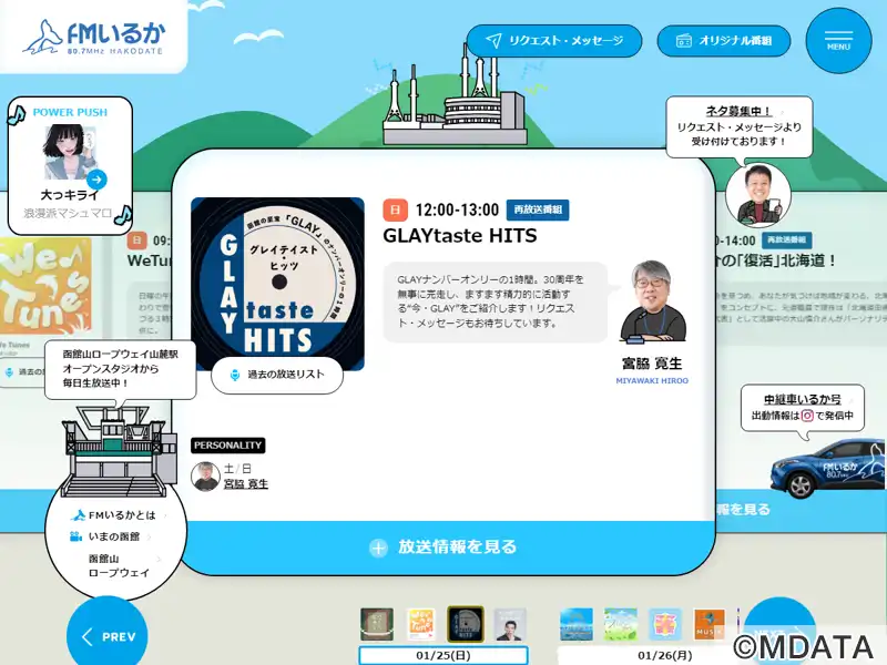 日本で初のコミュニティ放送局として1992年12月24日に開局した、函館市にあるコミュニティFM。周波数80.7MHzで、呼出名称「はこだてエフエム」。2015年11月に「函館山ロープウェイ」のオープンに伴い、函館山ロープウェイ山麓駅舎内に放送スタジオを移転し、1FロビーのオープンスタジオとB1の第2スタジオから毎日24時間放送。放送エリアは函館市・北斗市・七飯町。JOZZ1AA-FM。