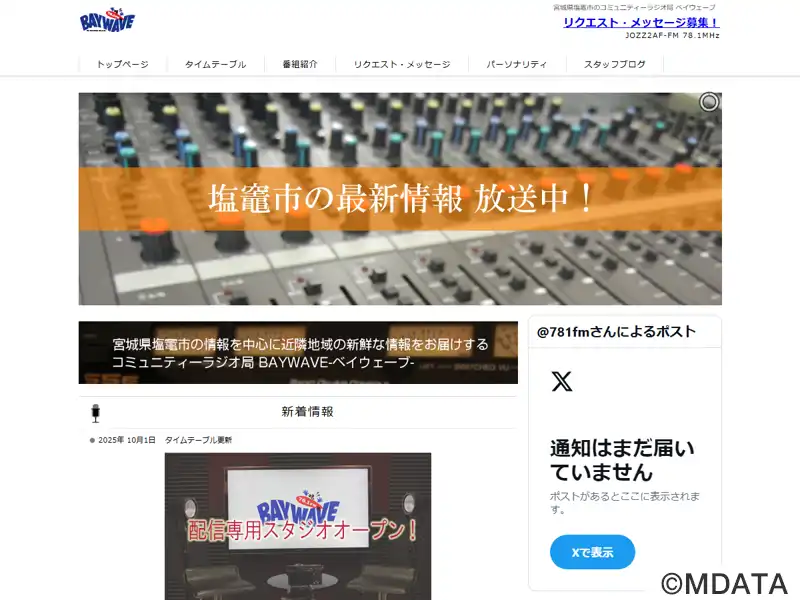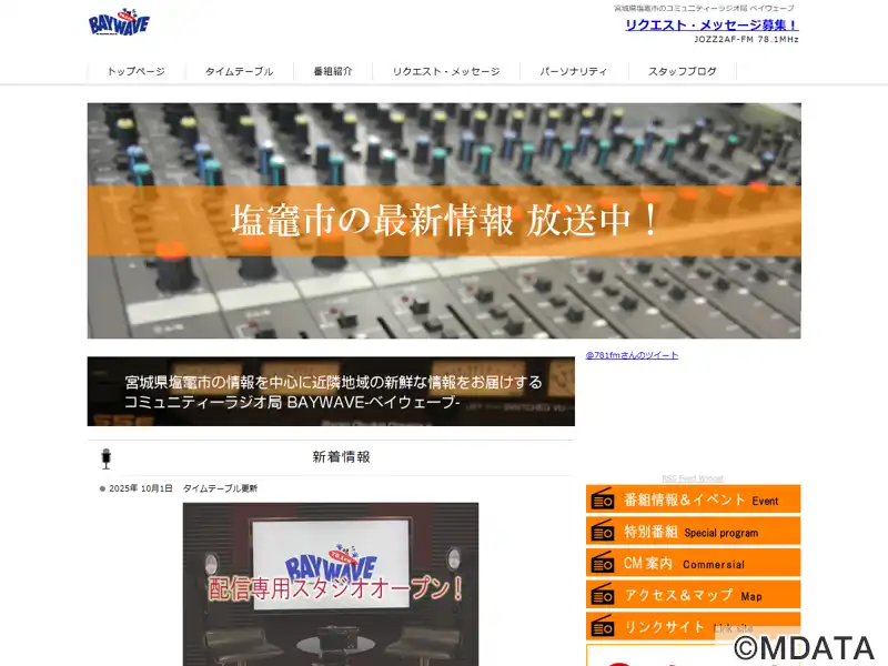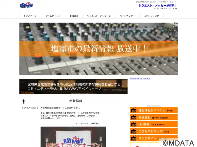 周波数78.1 MHzで放送する塩釜市のコミュニティFMラジオ局、BAY WAVE(ベイウェーブ)は1997年4月にエフエムベイエリア(株)の運営で開局。2011年3月18日から13年9月まで臨時災害放送局しおがまさいがいエフエムとして放送を行なった。18年10月に本塩釜駅神社参道口にスタジオを移転し、22年2月に配信スタジオを新設。放送エリアは塩竈市・松島町と近隣市町。JOYZ2T-FM。