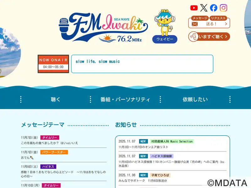 周波数76.2MHzで放送する、福島県いわき市のコミュニティFMラジオ、愛称SEA WAVE FMいわき。いわき市民コミュニティ放送が1996年9月1日に開局した、第三セクター運営のFM局。湯ノ岳送信所と14の中継局があり、いわき駅前通りのスタジオから生放送のワイド番組やお楽しみ番組、震災関連番組を中心に24時間放送。放送エリアはいわき市内、楢葉町、富岡町と広野町の一部区域。JOZZ2AE-FM。