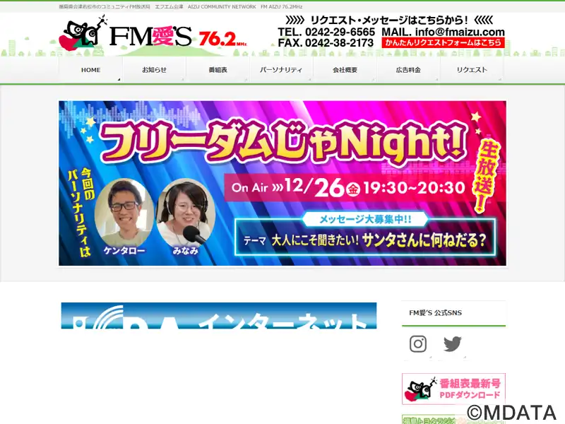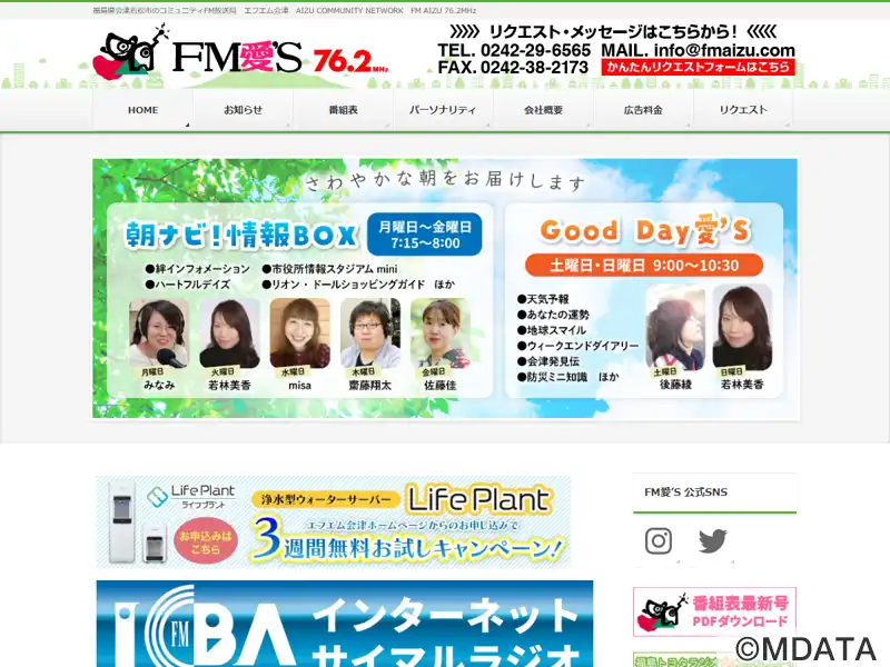 FM愛'Sの愛称をもつ福島県会津若松市のコミュニティFM局。1996年9月21日に開局。周波数76.2MHzで、神明通り(国道121号線)のリオン・ドールガーデン5階に設置されたスタジオから、朝・昼・夕方の生放送番組を中心に、会津地方の身近な地域情報を発信している。2011年2月14日よりサイマルラジオ配信を開始。放送エリアは会津若松市と周辺6市町村の一部。JOZZ2AD-FM。