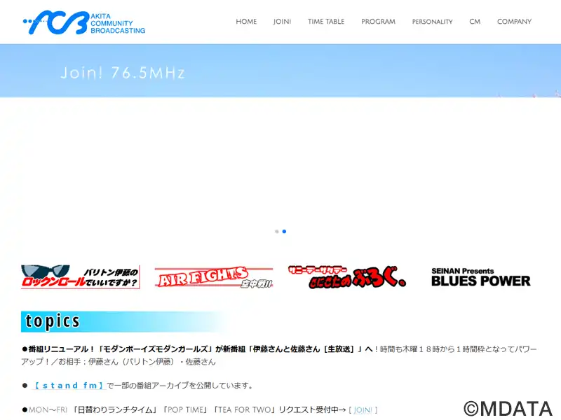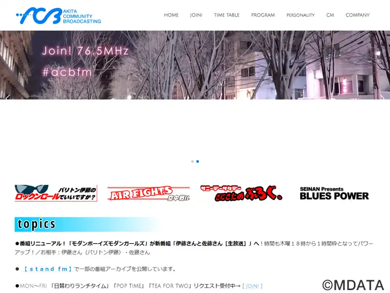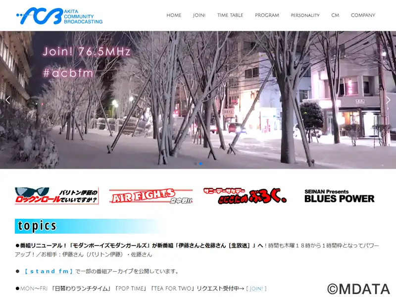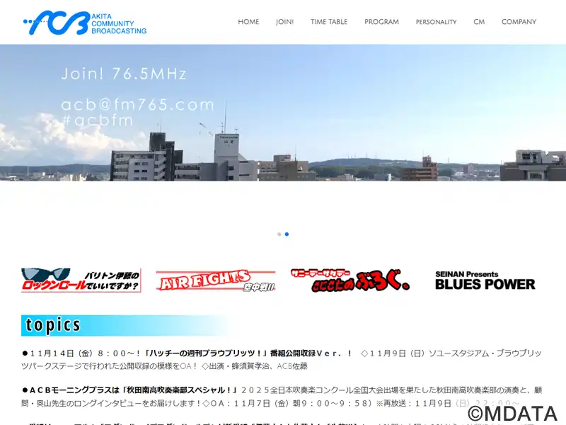 秋田県初のコミュニティFMとして1999年12月に開局した秋田コミュニティー放送(略称ACB)。周波数76.5MHzで24時間放送。2008年からは寺内地区、2018年4月からは山王大通りの東カンビル1Fに本社スタジオを移転し、地域に密着した生活情報や音楽番組、行政情報、防災情報など発信。自社制作番組以外はミュージックバードを再送信。放送エリアは秋田市の一部。JOZZ2AM-FM。