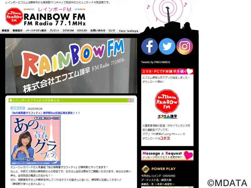 諫早市から周波数77.1MHzで放送中のコミュニティFM放送局、愛称レインボーエフエム。2000年1月1日、長崎県初のコミュニティ放送として開局。長崎県央地域を放送エリアとし、諫早市健康福祉センターB1Fに設けたスタジオから地域の身近で役立つ情報を発信。24時間放送で自主制作番組以外はミュージックバードを再送信する。ネット配信(FMプラプラ)でも聴取可能。JOZZ0AL-FM。