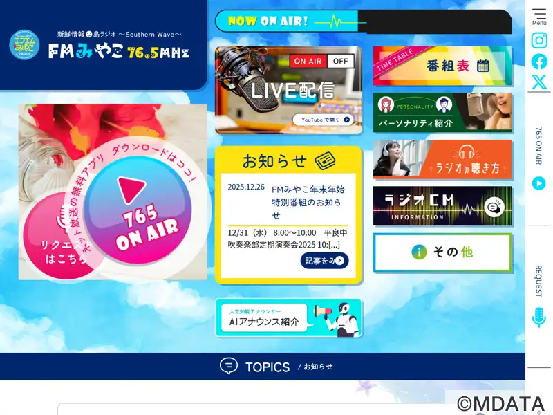 宮古島市から周波数76.5MHzで放送するコミュニティFM放送局、FMみやこ。沖縄県内の離島で初のコミュニティ放送局として2002年7月20日開局。2010年に上野野原トロピカルフルーツパーク内から平良にスタジオを移転。上野・多良間に中継局を設置し、自社制作や市民スタッフ制作番組に加えミュージックバードを再送信。18年よりネット放送開始。放送エリアは宮古島市と多良間村の一部。JOZZ0AR-FM。