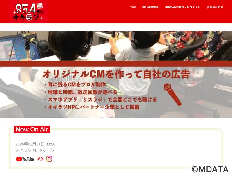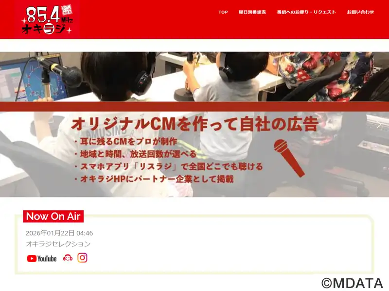 周波数85.4MHz。沖縄の音楽発信地、コザ・ミュージックタウンに2009年5月15日開局したコミュニティFM放送局。通称オキラジ。沖縄ラジオ株式会社が運営。朝・昼は中高年向け、19時以降は若い人向けの音楽プログラムで24時間365日放送中。サイマルラジオ・インターネット同時配信。全番組録画配信も実施。放送エリア:沖縄市、うるま市、嘉手納町、北谷町、北中城村の一部。JOZZ0BI-FM。