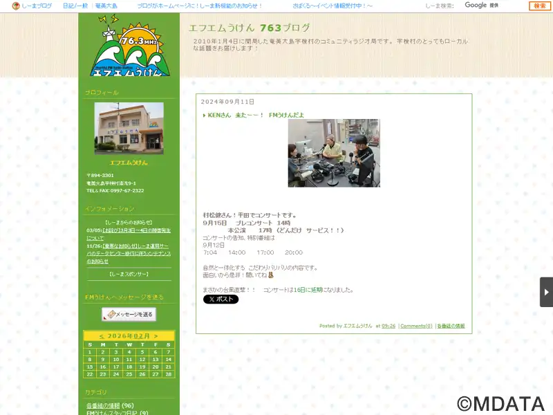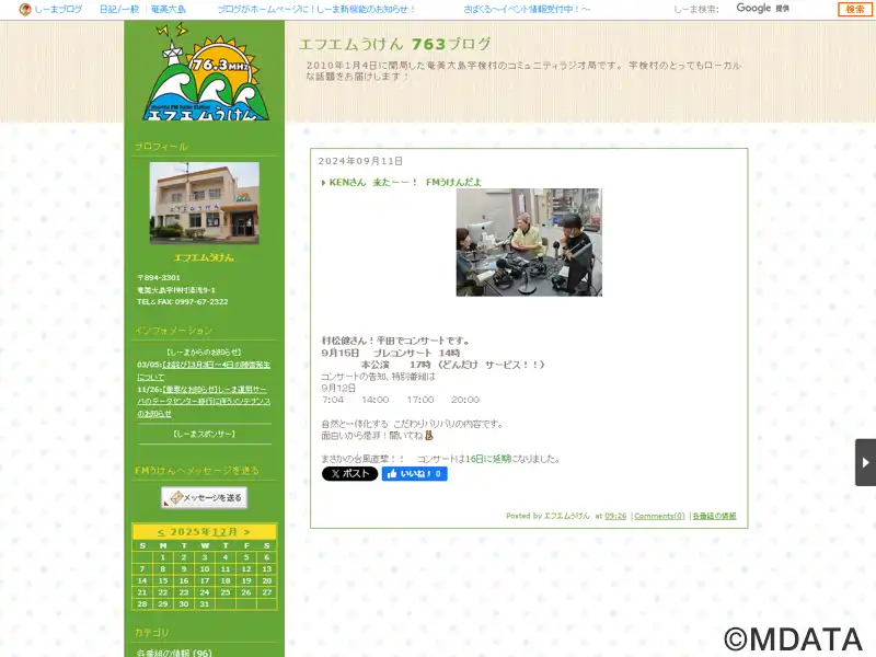 周波数76.3MHzで放送する奄美大島宇検村のコミュニティ放送局。NPO法人「エフエムうけん」が運営し、2010年1月4日に鹿児島県内7局目として開局。村民参加のトーク番組やローカルな話題を中心に、自主制作番組以外では、あまみエフエムディ!ウェイヴ(奄美市)やMBCラジオ(南日本放送)の中継放送を行なっている。また、防災行政無線の代替として、災害・緊急放送にも対応。JOZZ0BL-FM