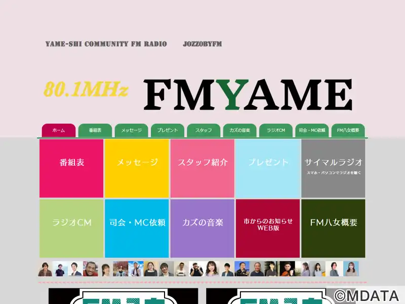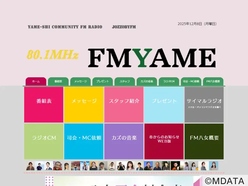 周波数80.1MHz、2012年6月に開局(県内5局目)した福岡県八女市のコミュニティFMラジオ局「FM八女」。一般財団法人FM八女が運営。黒木総合支所内の本社スタジオと「おりなす八女」1Fにサテライトスタジオを設置。八女市全域へ防災・行政・生活情報を提供。自主番組以外はミュージックバード再配信。サイマルラジオ放送あり。市が全戸に防災ラジオ無償配布。JOZZ0BY-FM。