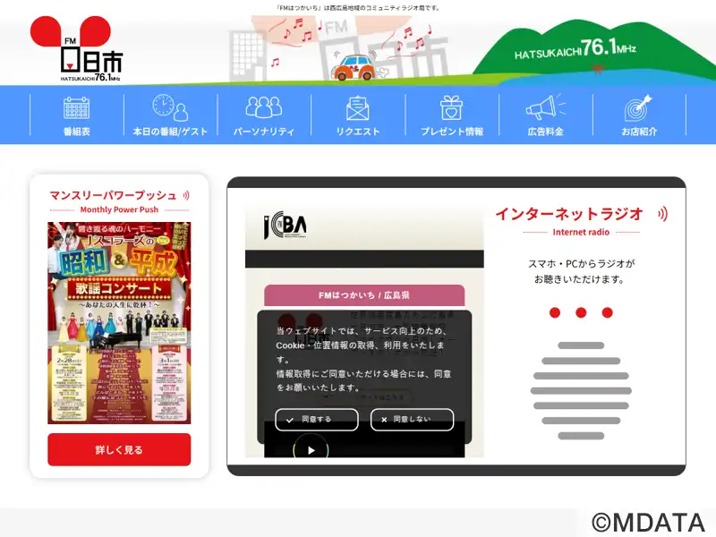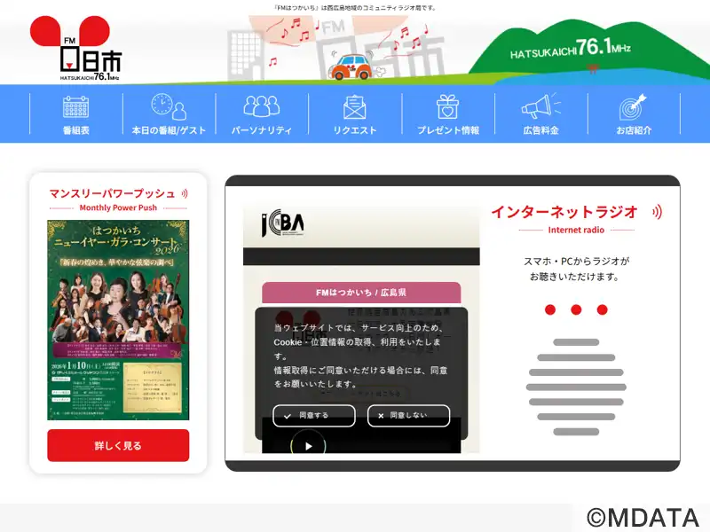 周波数76.1MHzで放送中の廿日市市を中心とする西広島地域のコミュニティFM局。FMはつかいちは2008年2月23日に「地域密着・顔が見える放送局」として開局。15年6月には廿日市市住吉からゆめタウン廿日市3Fにスタジオを移転し、24時間放送を開始。自社制作番組とミュージックバード制作番組で編成している。中継局2局の開設により廿日市市、広島市佐伯区、西区の一部をカバー。JOZZ8AP-FM。