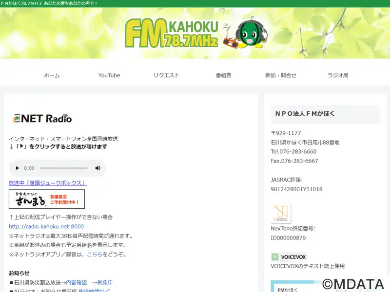 かほく市のNPO法人が運営するコミュニティFM放送局。2008年7月21日(海の日)に開局し、周波数78.7MHzで24時間放送。キャッチフレーズは「あなたの夢を!あなたの声で」。地域市民がパーソナリティーとして参加する約70のトーク番組が特徴。2010年からインターネット配信を開始し、津幡町・かほく市の防災緊急割込放送に対応。聴取区域かほく市・津幡町・内灘町と周辺地域。JOZZ5AM-FM。
