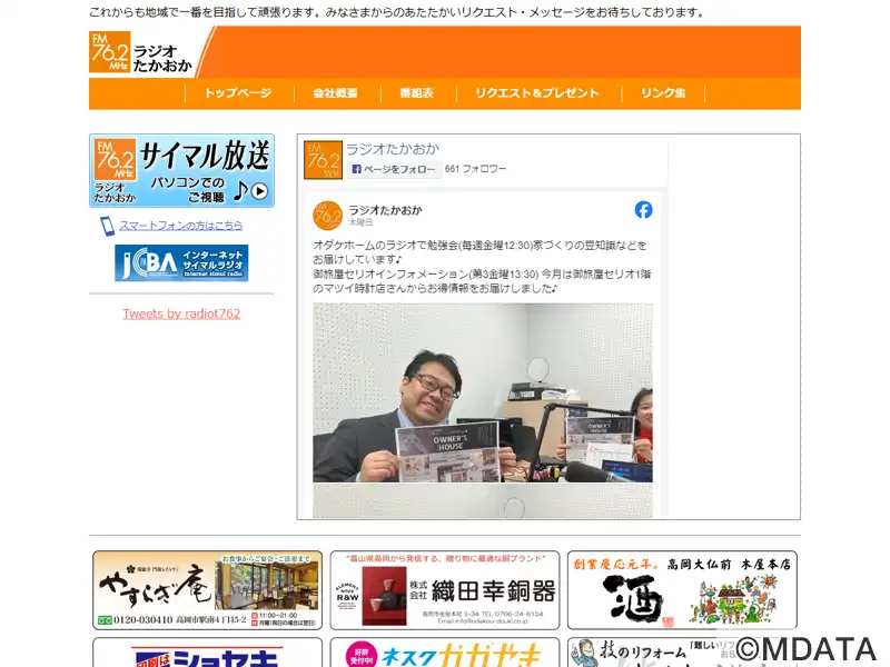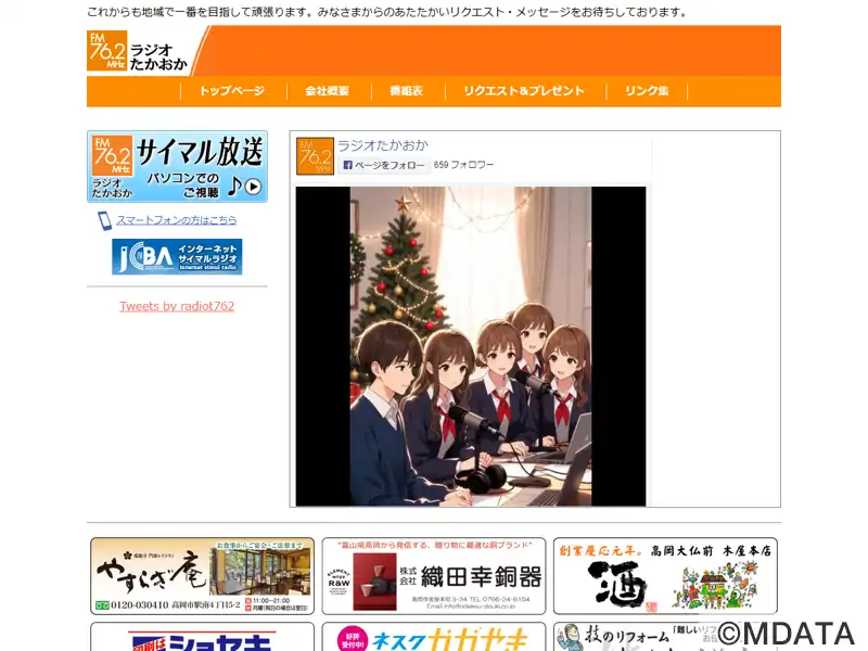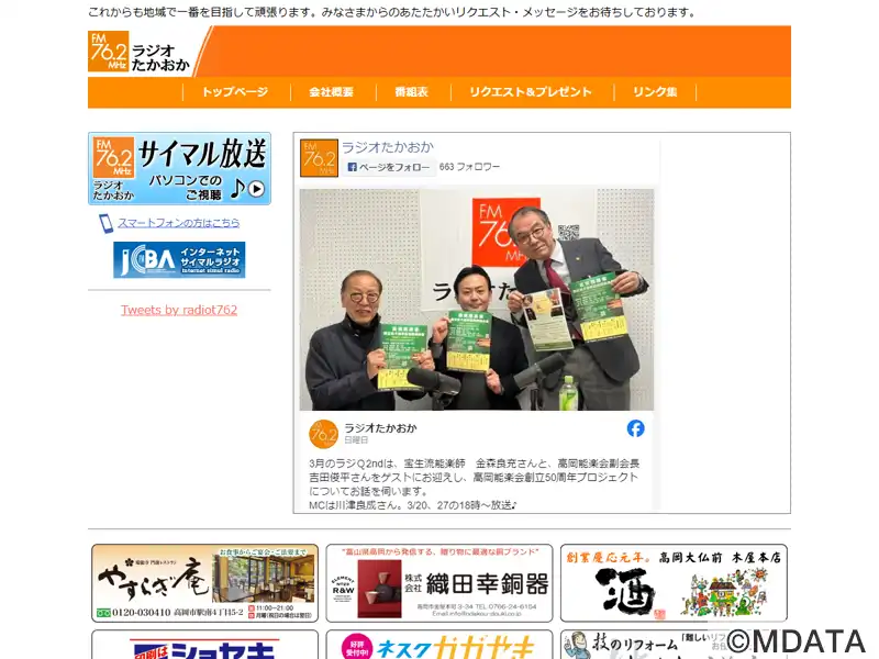 1996年12月に開局した富山新聞系列のコミュニティ放送局。高岡市広小路の富山新聞高岡会館3Fから76.2Mhzで24時間放送(日曜日は19時間)。『地元の身近な放送局』として、平日の生放送番組を中心に、ネット番組やミュージックバード制作番組で編成。また、高岡市の災害情報緊急放送にも対応。可聴エリアは高岡市、射水市、小矢部市、氷見市、砺波市、南砺市および富山市の一部。JOZZ5AE-FM。