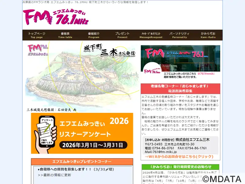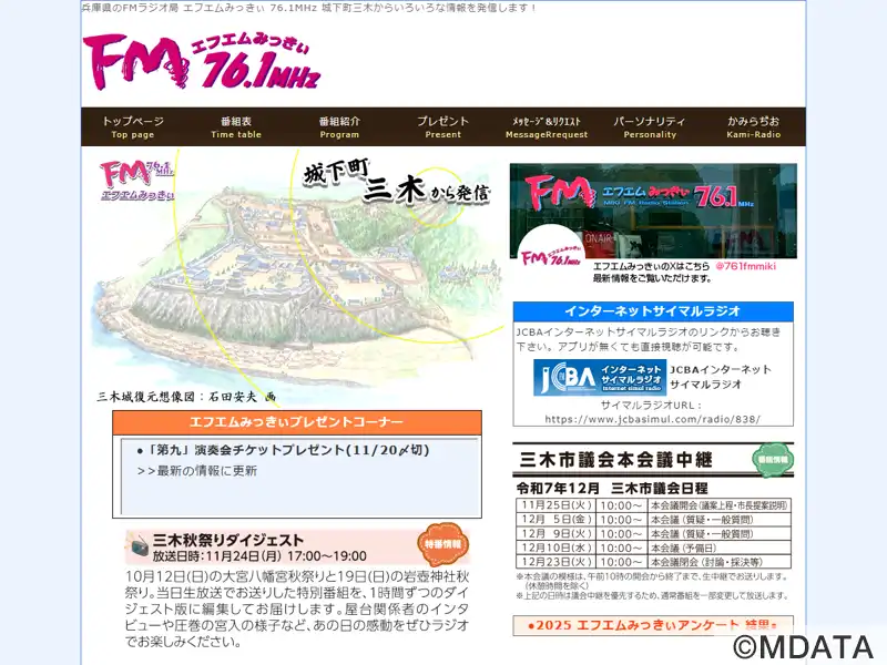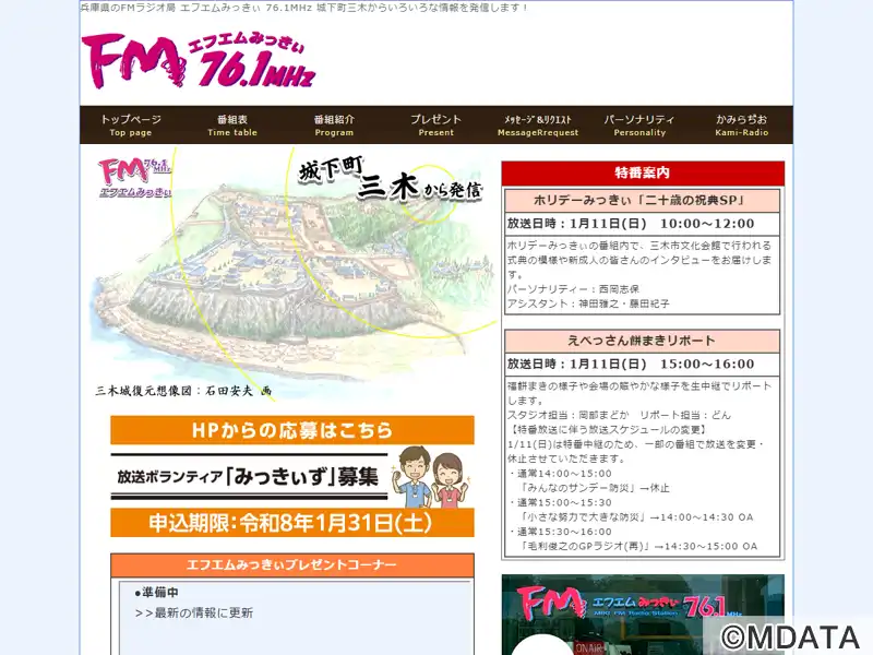 兵庫県三木市を拠点とするコミュニティFM局。周波数は76.1MHz、コールサインはJOZZ7AH-FM。1996年に三木市や商工会議所などが出資する第三セクター方式で開局し、市役所内のオープンスタジオから放送を行っている。地域ニュースや行政情報、市議会中継、天気・交通情報など、三木を中心に北播磨地域の生活に密着した内容を自社制作番組として発信。災害時の緊急放送や防災・防犯情報にも力を入れている。