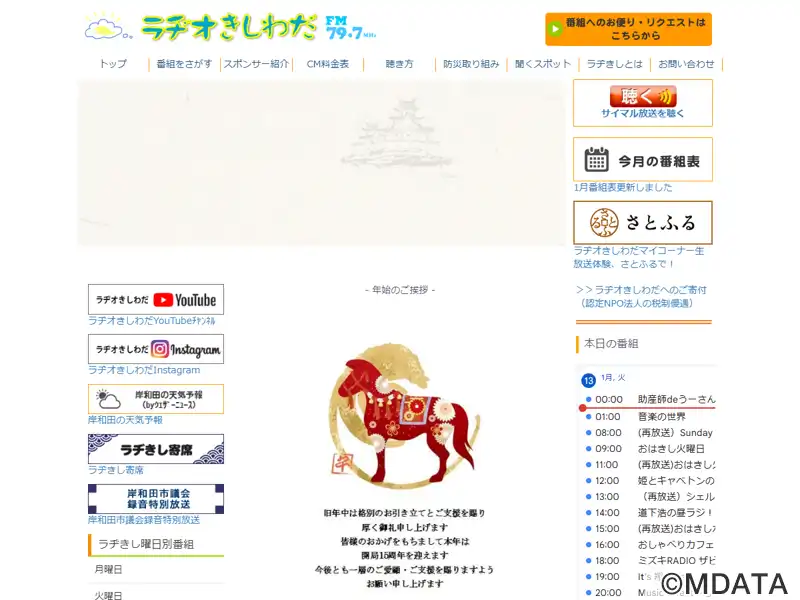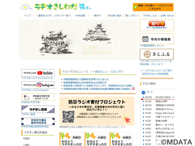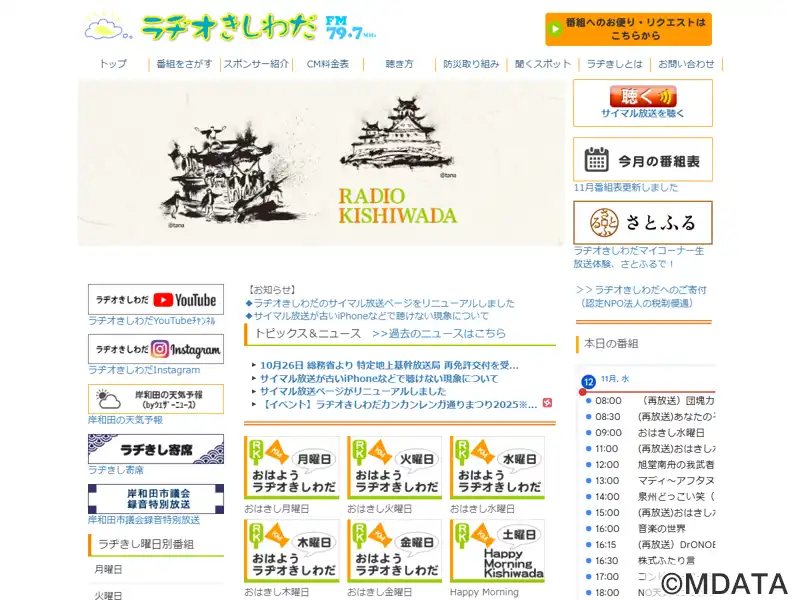 周波数79.7MHz。2011年5月10日に開局した大阪・岸和田市のコミュニティFM局「ラヂオきしわだ」通称:ラヂきし。「NPO法人ラヂオきしわだ」が運営。身近な人が地域に密着した普段着の情報を発信。すべて自主制作番組で24時間放送(日曜深夜を除く)。生放送は8時から22時。毎年岸和田だんじり祭の生中継を実施。独自サイマル配信。放送区域:岸和田市のほぼ全域と貝塚市の一部。JOZZ7BK-FM。