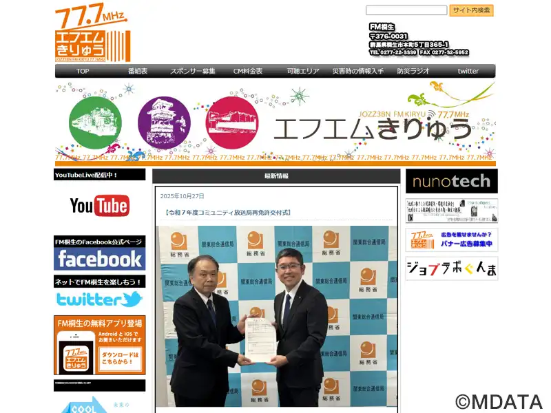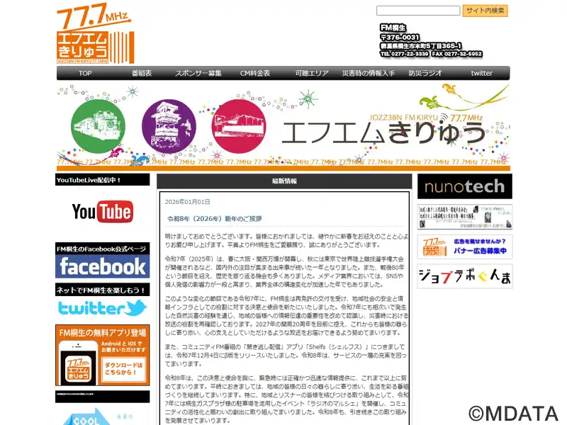 2007年7月に開局した桐生市のコミュニティFM放送局。周波数は77.7MHz。桐生ガスプラザ3Fのスタジオと、1FにサテライトのRSわくわくスタジオを設置。地域情報満載の生放送を中心に、市民参加のユニークな自主制作番組を放送している。全国的にも珍しい吹奏楽専門番組「吹奏楽の調べ」や、地元アーティストやDJによる音楽番組も充実。FM++対応。放送エリアは桐生市街地周辺地域。JOZZ3BN-FM。