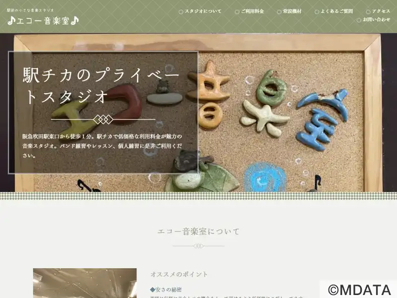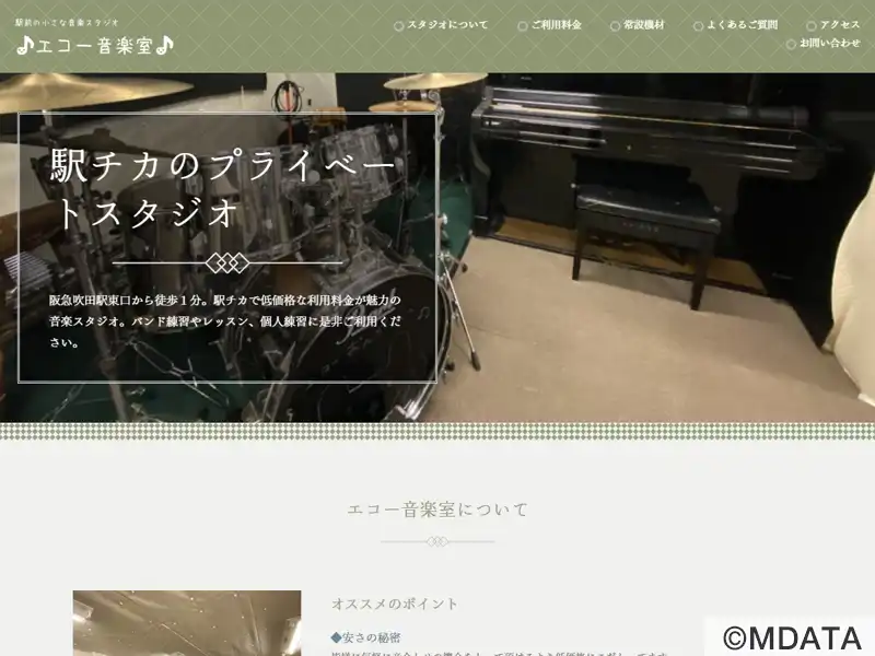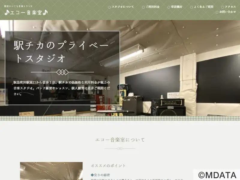 阪急吹田駅からJRをくぐってすぐ、駅前の小さな音楽スタジオ。低価格にこだわった無人スタジオで、3人以下、4~5人、6人以上の3つの価格帯を設定し、リハーサル、バンド練習・個人練習、レッスンに気軽に利用できます。壁と天井に厚めの吸音素材を使用したデッドな音響空間は大人数でも管楽器が入っても大丈夫。スタジオ予約は電話のみ受付(2時間単位)。オールナイトレンタルも可能。