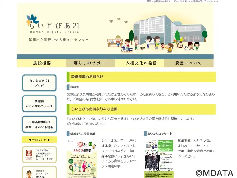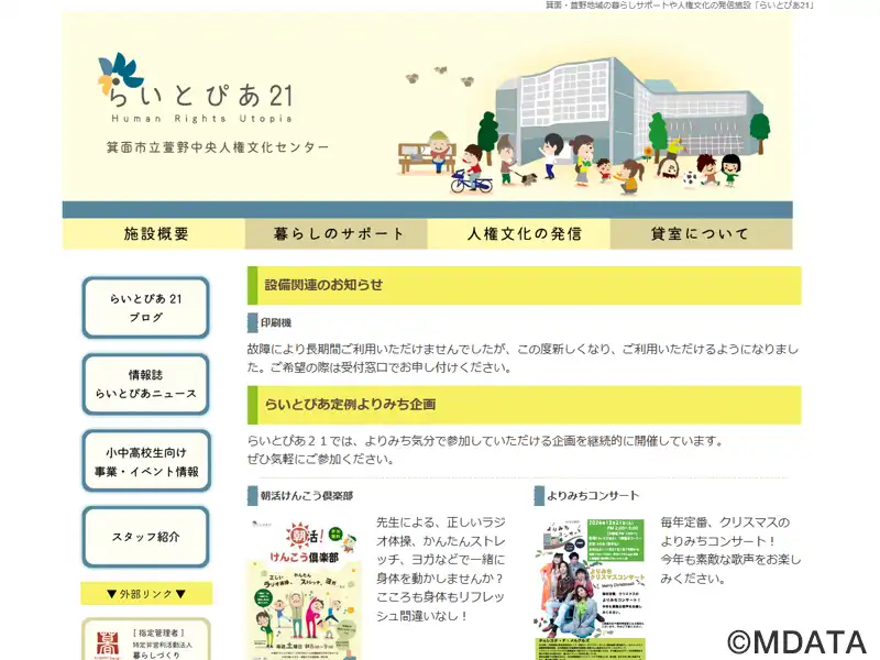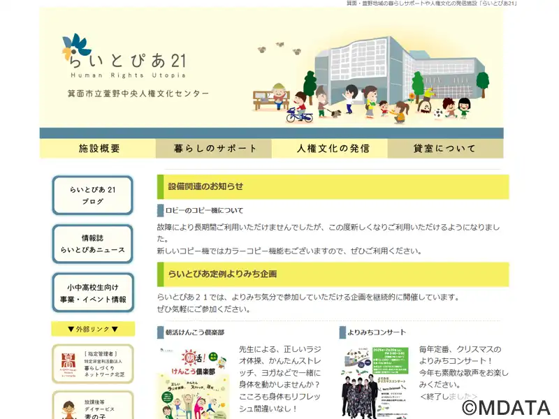 箕面市市民の人権意識向上を目指し、様々な方々の暮らしのサポートや人権文化の発信を行う施設で、ホールや音楽室の貸し出しを行っている。メインホールは200人収容可能なフラットスペースで、73㎡の舞台とピアノ、音響・照明設備があり、ミニコンサートや演劇、各種イベントに利用可能。音楽室にはピアノ、ドラムなどの設備があり、楽器や合唱、バンド練習に対応。また、多目的室、会議室、和室、料理実習室なども備えている。