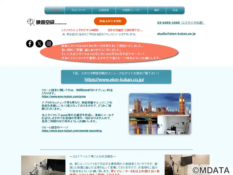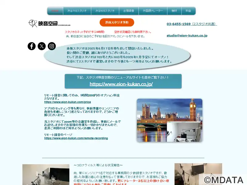 東京渋谷にある「スタジオ映音空間」が運営する渋谷スタジオ。1998年創業。10畳のモニタールームや録音ブース、リビングルームなど、広く洗練された内装に加え、2重防音構造と高い吸音性能を備えている。ナレーションやMA、ボーカル録音に特化し、特にボイス収録に最適化された設計で、業界水準の機材による高音質かつ静音な収録環境を実現。また、遠隔地とのリアルタイムモニタリングやディレクションにも対応している。