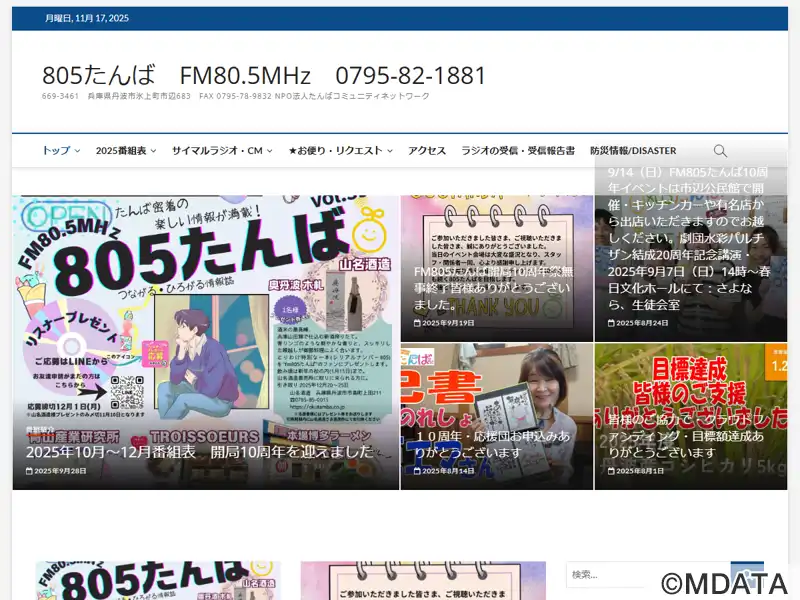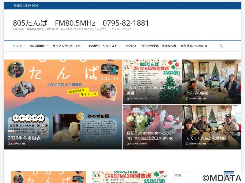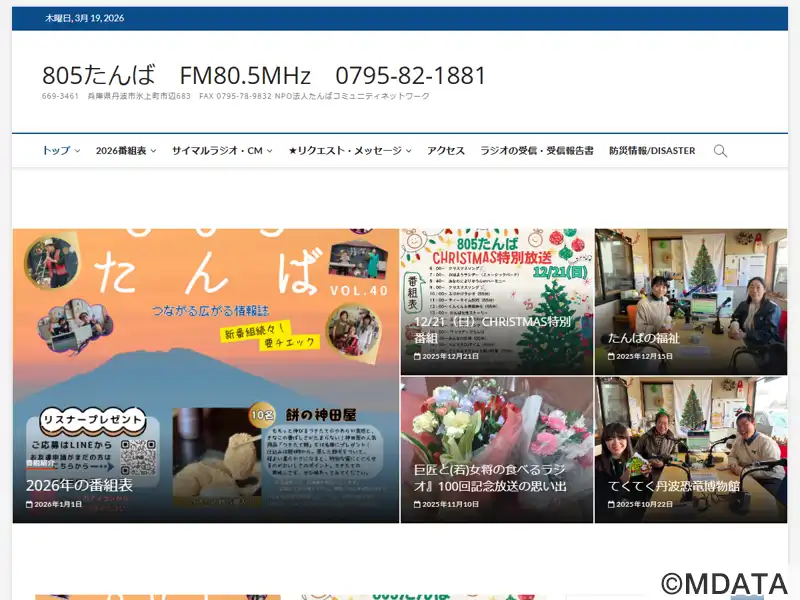 「805たんば」の愛称で親しまれている、特定非営利活動法人たんばコミュニティネットーワークが運営する、丹波エリア初のコミュニティFM放送局。臨時災害放送局たんばしさいがいエフエム(2014.9.17-11.30)を前身とし、周波数80.5MHzで、2015年9月17日に開局した。倉庫を手作りで改装した木造平屋の収録スタジオで、市民ボランティアを中心とした番組作りを行っている。JOZZ7BM-FM