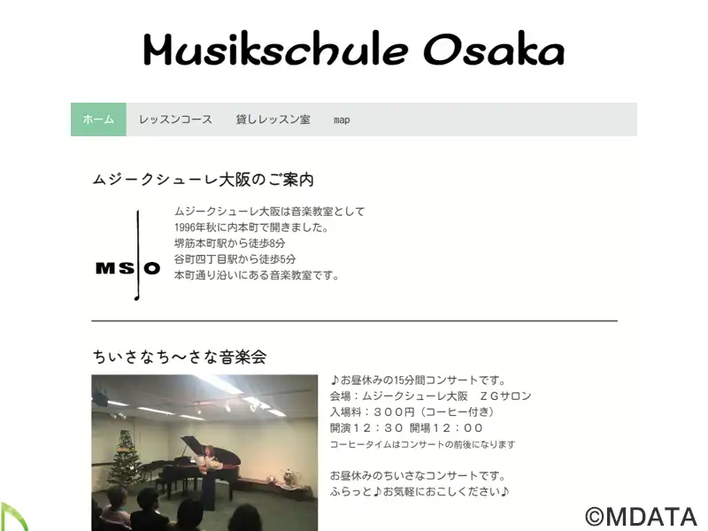 大阪市・谷町四丁目駅から徒歩5分の本町通り沿いに1996年開校した音楽教室。ピアノ、声楽、管楽器、弦楽器、音大進学の各コースを設け、年齢を問わず、初心者から上級者まで、丁寧に指導している。また、レッスン室やサロンの貸し出しも行っていて、グランドピアノがあるE室・F室、アンサンブルに適したG室、サロンコンサートが開催できる40席のZGサロンなどがあり、サロンでは「ち~さな音楽会」を開催している。
