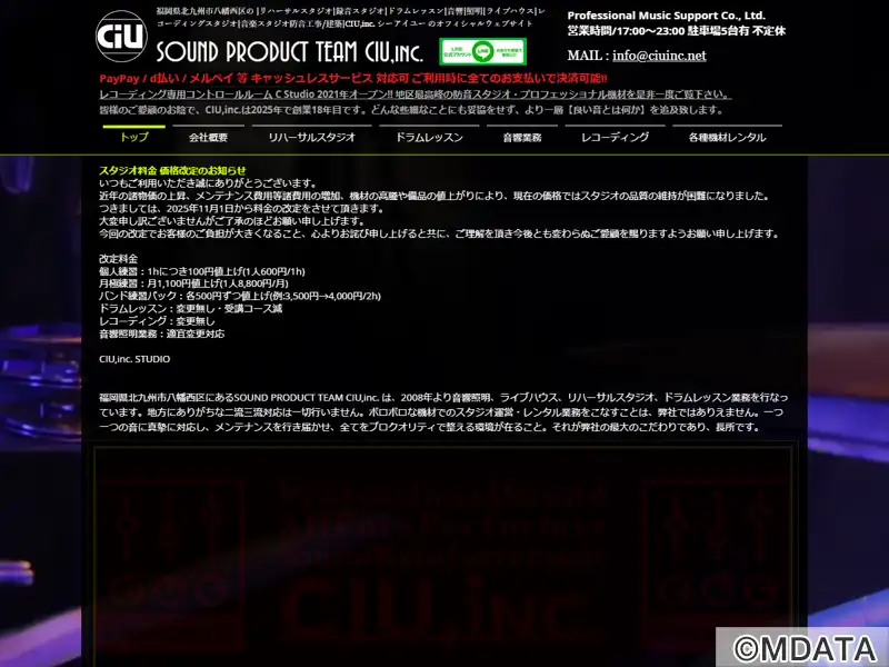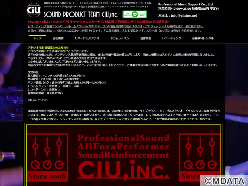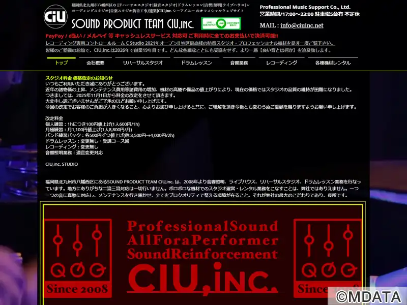 北九州市八幡西区で2008年に開業した総合音楽施設。リハスタ運営を中心に、レコーディング、ドラムレッスン、音響・照明業務、楽器レンタル、音楽イベントの企画・運営など、多岐にわたるサービスを提供。プロ仕様の設備と、高度な防音技術と精密にメンテナンスされた環境のもと、経験豊富なエンジニアによる録音・ミキシング・マスタリングを行う。地域の音楽シーンを支える拠点として、幅広いミュージシャンに利用されている。