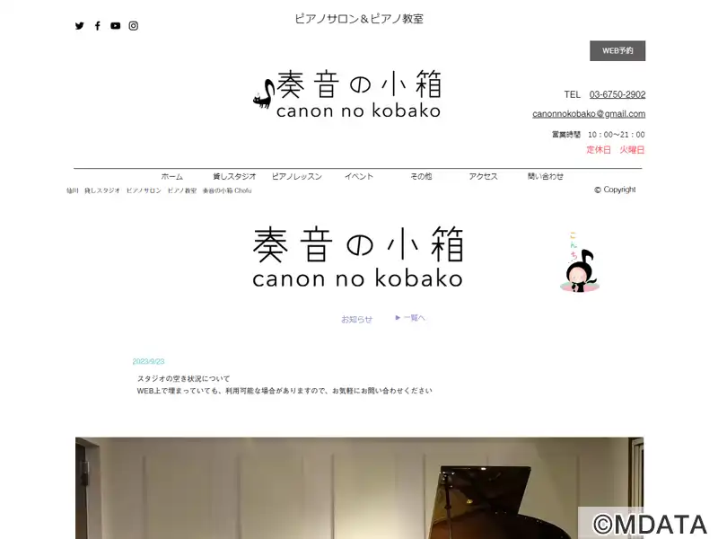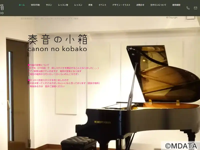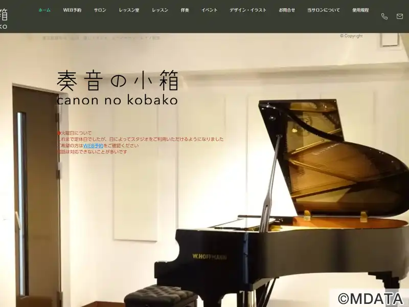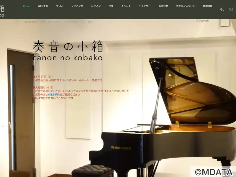 東京調布市の仙川にあるピアノサロン&レッスンスタジオ。サロンホールには、グランドピアノホフマンT-161を備え、25席の客席を持つアットホームな雰囲気の中で、ピアノ、声楽、弦楽器、管楽器などのアコースティック音楽のコンサートや小規模音楽会、発表会などに最適な空間を提供。本番前のリハーサルや練習にも利用できる。また、アップライトピアノのあるレッスン室では、子供から大人までのピアノ教室を提供している。